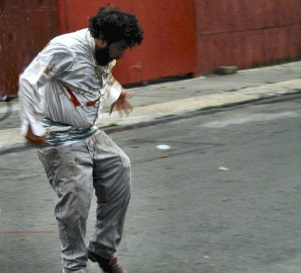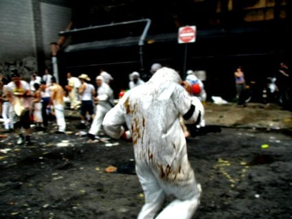 “Welcome to the condiment war,” a woman shouted into a megaphone, and a cheer went up. She recited rules of engagement, but these were ignored as a bagel was shot from some sort of cannon. A cabbage flew from a rooftop, trailing its leaves, smashing into asphalt as a stream of catsup arced through the air. The crowd burst into condiment violence. I pulled out my camera and walked gingerly into the frenzy as a watermelon launched into the air and exploded. Screaming people standing on a hot dog cart fired balloons filled with chunk tomatoes from a trebuchet.