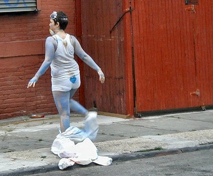 In this summer mood I pedaled past York Street subway stop, where I saw a clustering of souls, all in white painting suits, holding big water pistols and cans of catsup. A few blocks later I found others dressed the same way, and smelled mustard. A woman held a flag emblazoned with the silhouette of the country of Madagascar. Someone else had a flag with the word WAMP painted on the fabric in block letters. The air was filled with voices.