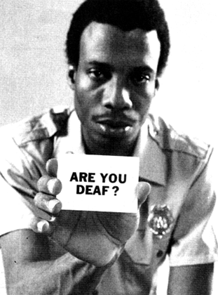 This badly-scanned fellow was used on college radio-show posters. There is no Photoshoppery involved in the card; it really does say “Are you deaf?” The image is from a first-aid manual for emergency medical technicians.