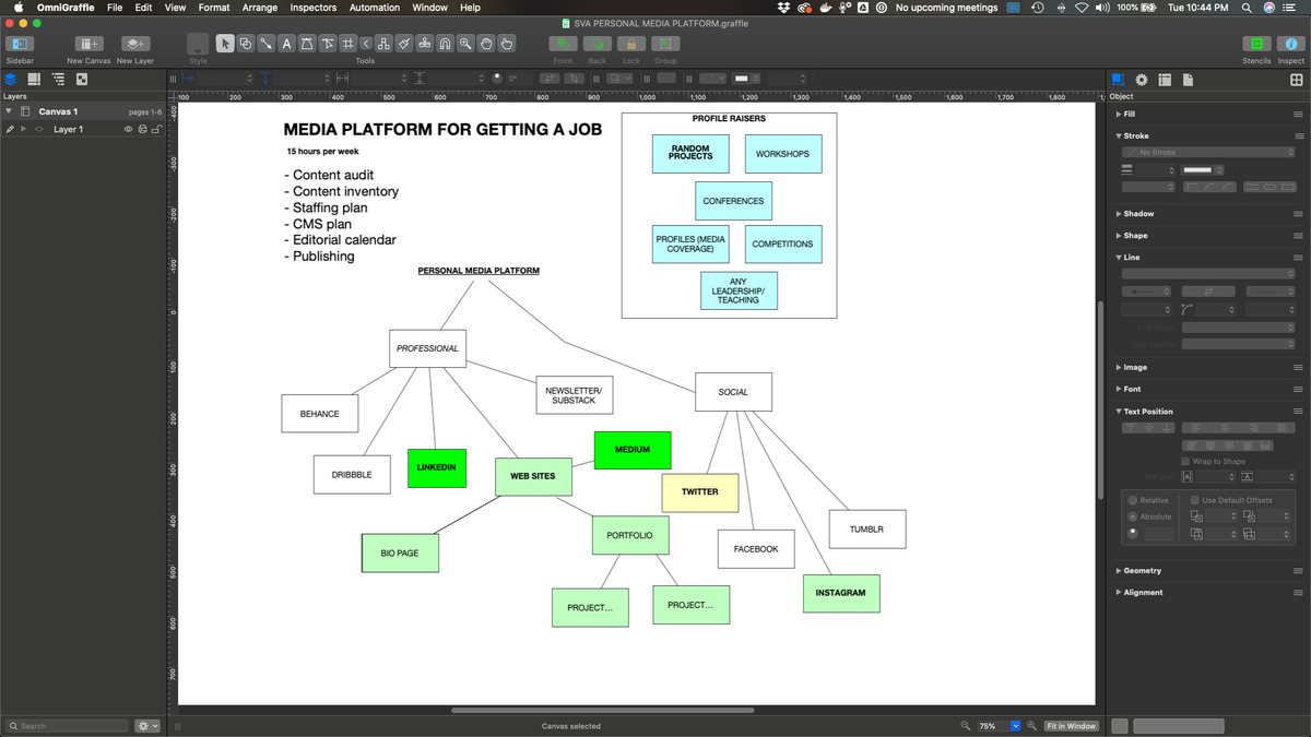 Bananabears, the Seattle firm The Omni Group has been around for a long time in software. Originally it was a firm that made software for the NeXT computer. Then Apple bought NeXT and based Mac OS X on their operating system, so over the ensuing years The Omni Group made a lot of Mac products that I loved to pay for, back in the days when you would buy software instead of either getting it for free or paying thousands of dollars to subscribe to it (with nothing in between except the refund they give you when Facebook buys the company and shuts it down). There is OmniOutliner, OmniPlan, and my much-beloved OmniGraffle, which is a diagramming tool but so, so much more. Well actually I mostly use it as a diagramming tool, sometimes when I’m teaching. When the doctor tells me to go to my happy place, here is where I go: