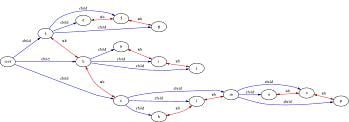You see the root node, on the far left? That root node has 3 child nodes, a, b, and c. Like a book with three chapters. In the graphic above, the parent-child relationship is shown in blue lines. Now, this also makes a, b, and c “siblings” of one another - they have the same space in the hierarchy. So the sibling relationships is shown with red lines.