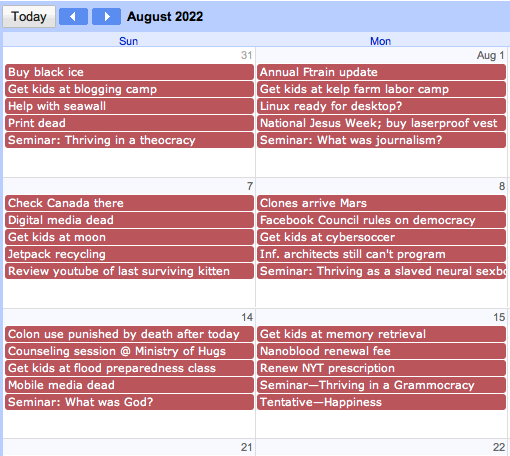 “Younger people are taking over now, which is probably fine,” is something I have for myself in 2024, when I’m 50. And for 2075, when I’ll be 101: “It’s totally okay and likely better for everyone if you’re dead,” In the “Description” field for that event is simply: “Start smoking.”