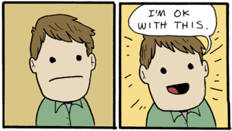 (Update: Thanks to Riaz Moola, Karl Dubost, Daniel Nugent, Josh Braun, Jason Alderman, Calvin Bienvenu, and Hex I learned that this image is by KC Green [who is disappointed that it has become a meme]. It’s the final two panels of a “Custom Comic”—comics created by audience request—entitled “Andys 16 Now - Bobby”. See also.)