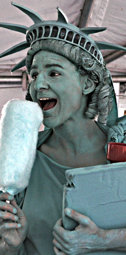 The Statue of Liberty, on stilts, eats cotton candy
