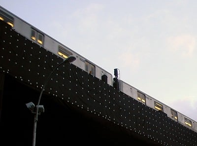 No one lives on this block. It is empty of all but passing life. On the left, the elevated F and G lines move through at intervals, straddling above a playground with thick latticework made up of steel beams coated in concrete. For years, the concrete was shedding, and you would find thick chunks of it, split in pieces from the 20-foot drop. The playgrounds located under the elevated line were often closed. Now they have wrapped almost the entire length of the structure in black plastic mesh, and studded it with silver rivets—“bedazzled it,” someone said. Where before it was simply dingy, it is now monstrous and elephantine, and so hideous that I am awed by its lurking presence.