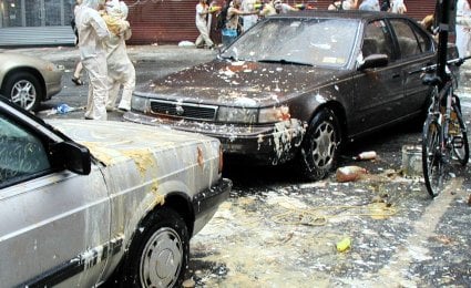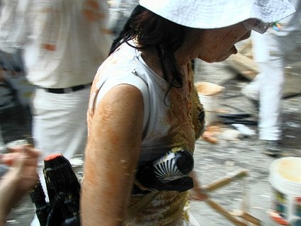 “Welcome to the condiment war,” a woman shouted into a megaphone, and a cheer went up. She recited rules of engagement, but these were ignored as a bagel was shot from some sort of cannon. A cabbage flew from a rooftop, trailing its leaves, smashing into asphalt as a stream of catsup arced through the air. The crowd burst into condiment violence. I pulled out my camera and walked gingerly into the frenzy as a watermelon launched into the air and exploded. Screaming people standing on a hot dog cart fired balloons filled with chunk tomatoes from a trebuchet.