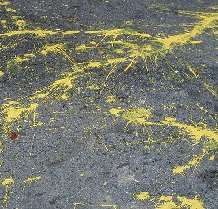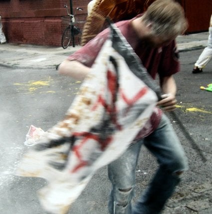 In this summer mood I pedaled past York Street subway stop, where I saw a clustering of souls, all in white painting suits, holding big water pistols and cans of catsup. A few blocks later I found others dressed the same way, and smelled mustard. A woman held a flag emblazoned with the silhouette of the country of Madagascar. Someone else had a flag with the word WAMP painted on the fabric in block letters. The air was filled with voices.