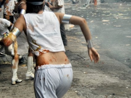 A block away I came on 100 people in white, many carrying different kinds of weapons.