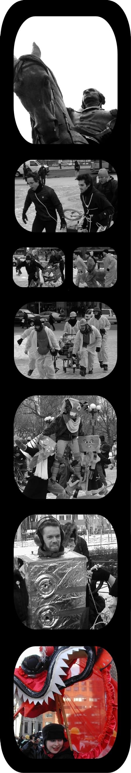This was, it turned out, the Idiotarod. 20-odd groups, all in the same configuration, with 4 “dogs” and 1 sled driver, yelling “mush,” behind a shopping cart. Each group had run, or walked, or stumbled from Brooklyn, across the Manhattan Bridge, through Chinatown, and up Bowery to reach the finish line. More teams came, and passing observers, speaking English, Japanese, and Czech, rolled their videocameras.