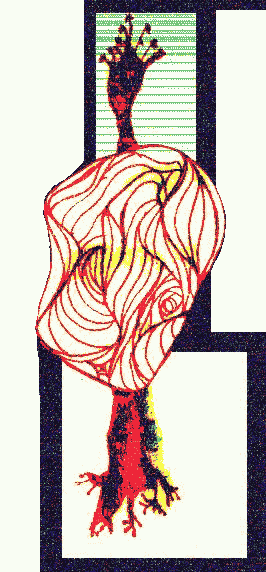 Prisoners and lunatics have malfunctioning versions of the structure, sometimes with the top and bottom ganglionic extensions reversed. Those raised in strictly religious homes have an extremely well-defined limiter/resistor arrangement, and often the organ (one cm or less in average humans) extends and grows over the entire body. In extreme cases, the organ can take over the brain and muscle function, creating a contant conflict of intent, rendering the victim incapable of either action or thought without extreme effort. Such victims often give off visible electric charges. Still others show a reversal phenomenon, where desire and effort yield the exact opposite result; examples here include the woman who will just “be good” about sleeping with men, yet goes home with one that night, the perpetual dieter who eats compulsively, and the child who wants to be nice to his mother, but throws something at her anyway.