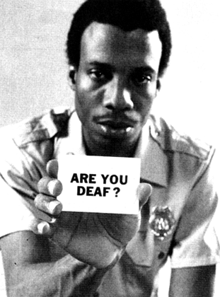 This badly-scanned fellow was used on college radio-show posters. There is no Photoshoppery involved in the card; it really does say “Are you deaf?” The image is from a first-aid manual for emergency medical technicians.