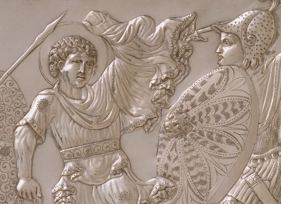 Heraclius, J.P. Morgan, and David are the names we know. The artist who made it is unknown; the person who cleaned the artist’s shop is unknown; the miners who dug out the silver, the caravans that carried it, the person who left the plate behind for centuries, all unknown. It’s just there now, hanging in the Byzantine collection to the right of the grand staircase, next to some of its sister plates, and far from Constantinople.