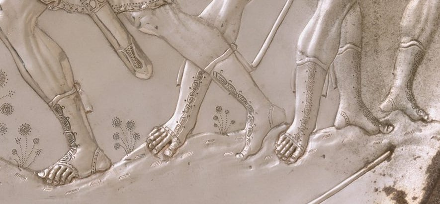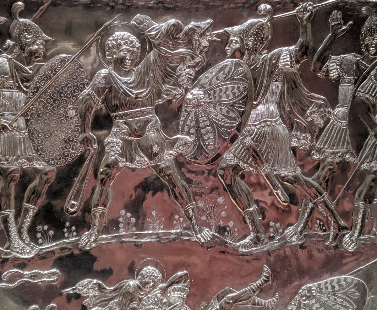 These plates were made around 630, and are possibly from the palace workshops of the Byzantine emperor Heraclius. This is why everyone on the plate looks pretty Byzantine, with defensive skirts. The plates also have Heraclius’s stamp to affirm the quality of the silver.
