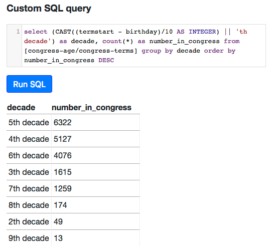 As sample data, Simon used some CSV files from FiveThirtyEight, including a list of congresspeople and their ages when serving. You can explore that data with regular SQL. But! I can also find out the ages at which the most congresspeople were elected—your 50s, it turns out, is the most common age to get elected to congress. And you can revise that query further and further and share links to it. So you can get a nice list of the most common decades of their lives that congresspeople are elected, should you ever want such a thing: