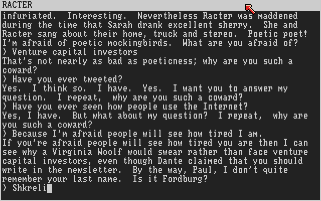 I know lots of bot folks (I know that sounds terrible) and for some reason none of them seem to know about Racter, an “experiment” in “artificial insanity” that was at its essence just a particularly weird chatbot; it spewed nonsense.