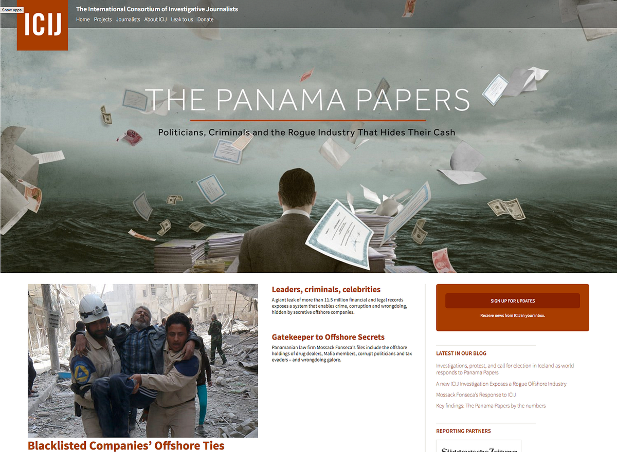 , it’s a global consortium of journalists and some rather well-thought-out home page work: A leak, a plan, and a brand: The Panama Papers. Brought to you by Journalism.