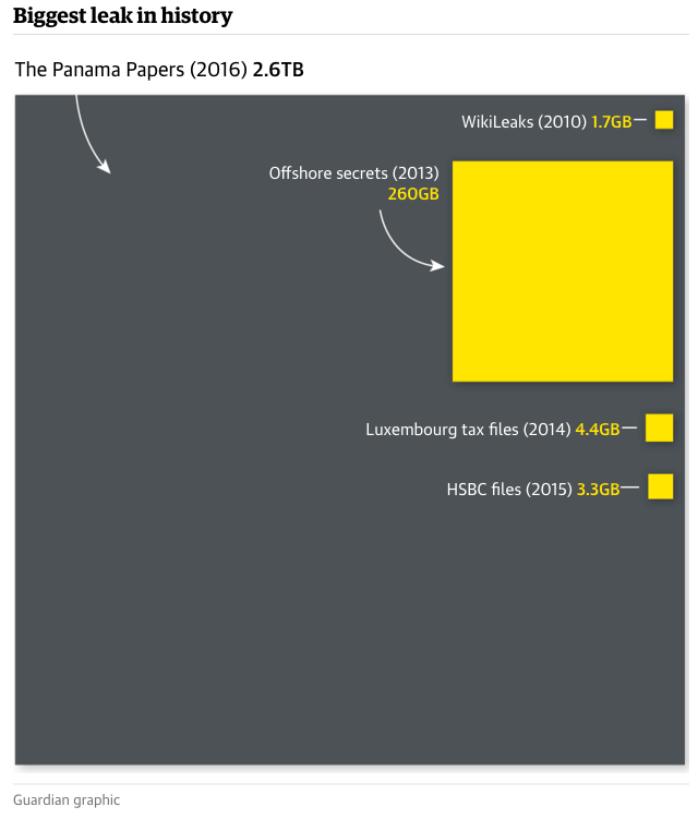 There’s a weird message here—throw away your garbage State Department telegrams, your stupid Ashley Madison databases, and get yourself some Panama Papers, 2.5 terabytes of pure raw corruption. Check out this graphic from The Guardian: