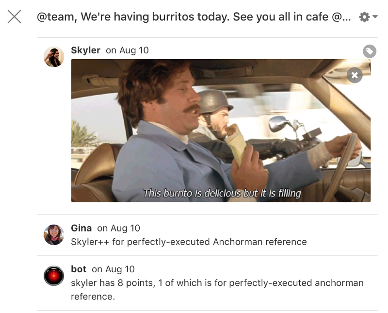 Bot also helps us publicly recognize a coworker’s brilliance (or a coworker’s unfortunate choice of words). The Hubot PlusPlus script gives bot the ability to add, subtract, and tally a score for anything, awarded simply by typing a name and adding a ++ (to give a point) or — (to take one away).