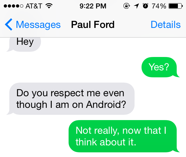 I mean, why not let the people who can’t afford your products have a nice shade of green—fern or pear, pickle or pistachio, maybe even sea-foam, instead of something that looks like glow-stick at a rave? They’ll still feel poor, I promise. It’s probably one line of code to change the color, to reduce the tension between the blues and the greens, to make it possible for a broke dude stuck on Android 4.1 Jelly Bean to mack on a rich girl with an iPhone 6 without her knowing that he’s not in the same ecosystem. Why be so petty, Apple? In any case, I’m sticking with Android.