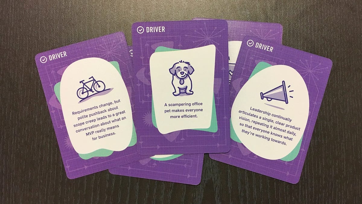 It’s a simple card game for three to five players, designed to help people talk through the various things that happen when you’re making software. You shuffle the deck and draw cards. Cards can be drivers, blockers, or actions. Your goal is to ship three phases of your project. You do this by getting rid of your blockers, collecting enough drivers, and yelling “SHIP IT!”