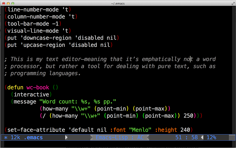 What makes Emacs different is that it’s not so much a program as an editor-development toolkit. The original Emacs used the TECO command language for its macros, but a major rewrite in 1984/85 provided a full-fledged programming language “under the hood,” called Emacs LISP (elisp). This version is the Emacs that we use today. You don’t need to program in elisp to use Emacs, but it’s there if you want to try something new. It’s absolutely, infinitely extensible.