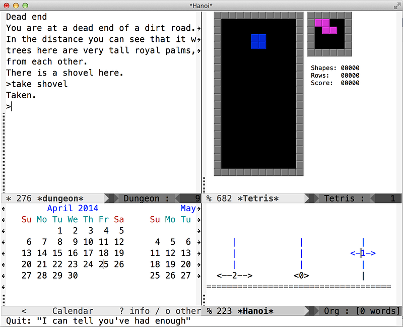 Since that rewrite the community around Emacs has been accreting little elisp programs into its standard library—thousands of them—that perform an extraordinary range of software tasks. When you download and use the program they are already installed, ready to use, and you can get yet more of them on the Internet. There are calendar programs, productivity tools, and outliners, a version of Tetris that is perfectly playable, a text adventure, tools for searching and replacing through thousands of files, and on and on, all built up together. As you work, whether writing code or writing prose, Emacs is constantly trying to guess what your text means; it tries to intuit what you want and what you mean. Being as it’s edging on 40 years old, it knows quite a bit.
