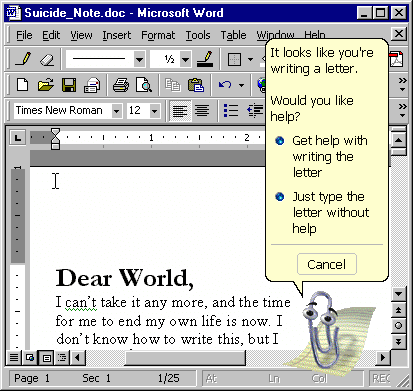 Dean did many things while at Microsoft but one of the things he’s best known for is killing “Clippy,” the little animated bot that helped you use Microsoft Office. Here is a screenshot of a typical, totally genuine Clippy interaction: