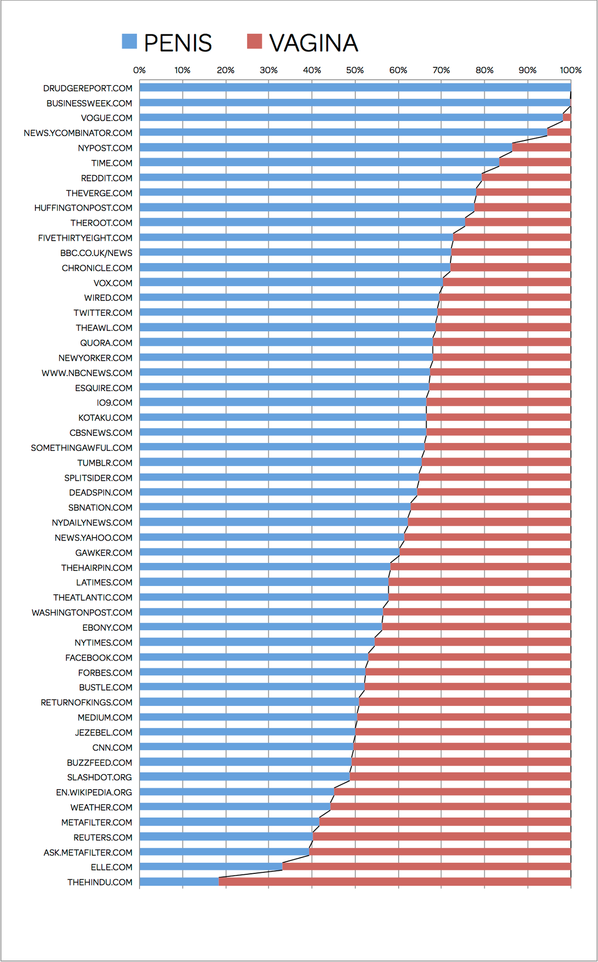 I had a stray idea and decided to chart how often web pages that contain the word “penis” appear on media websites like The Verge, BuzzFeed, and the New York Times, in comparison to the number of web pages on those sites that contain the word “vagina.” Here is a highly suspect chart showing the ratio of “penis” pages to “vagina” pages, using the search results from Bing.com (more below).