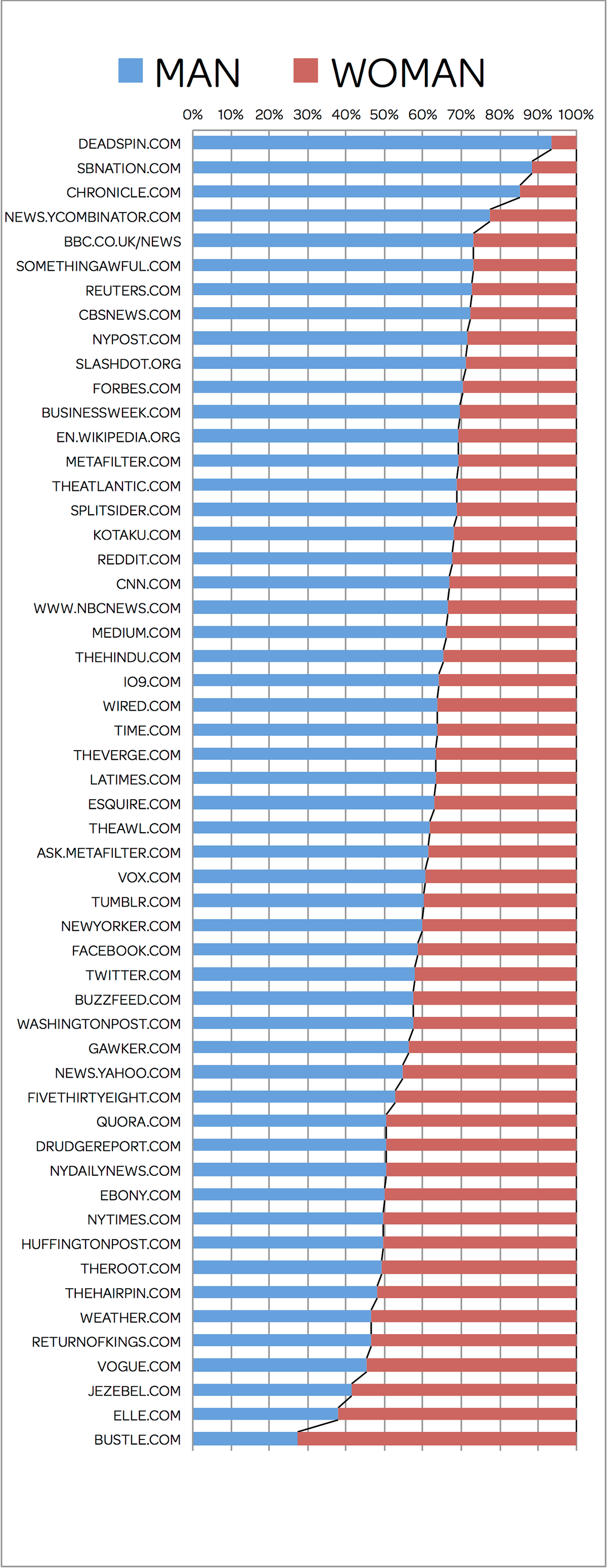 But for more common terms Bing does seem to dig up enough legitimate occurrences, and to accord roughly with perception. Looking at the chart below, comparing “man” to “woman,” common-enough terms, you could conclude that Deadspin and YCombinator’s Hacker News are sites about men, and that Elle and Bustle are about women. The data doesn’t quite support exactly that conclusion, of course, but…it’s interesting to see the breakdown.