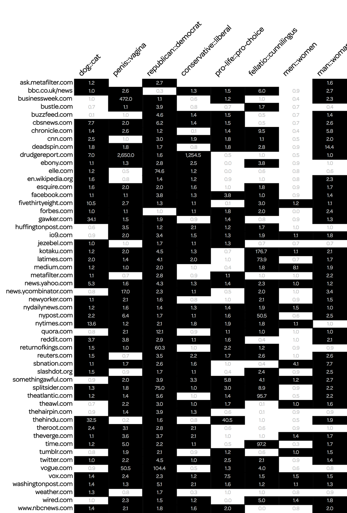 To close out this exercise, I made a chart that shows all the sites in alphabetical order, and all their words— and if the ratio is greater than 1.0, then that cell is black. In a way this chart provides a kind of mental thumbprint for the priorities of each site, suitable for your wallet.