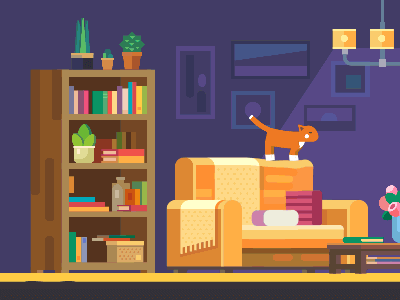 It turns out that the rampaging cat GIF is actually a sort of teaser or trailer — you can buy all of the visual elements in the image (including the cat), for re-use in your own projects — 60 items in all! — and they’re all cut up nicely as vector graphics, so you can resize them and use them however you’d like.